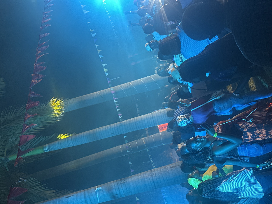 A crowd is gathered, illuminated by blue stage lighting. Diagonal rows of what appear to be coconut tree trunks stretch upward across the image. Strands of triangular pennant flags are strung between the trunks. Red flags are visible on the left, along with a palm frond lit by yellow light. The crowd is a diverse mix of people, many looking toward the stage.