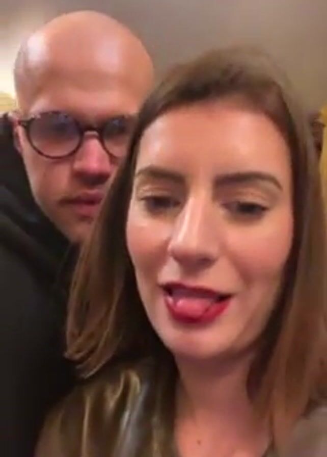 A video shows a man and a woman posing for the camera. The man is bald, wears glasses, and is in a black hoodie. The woman has brown hair, wears red lipstick, and is in a leather jacket. They are close together, and the woman is holding the camera. The background is blurry and indistinct, but appears to be indoors.
