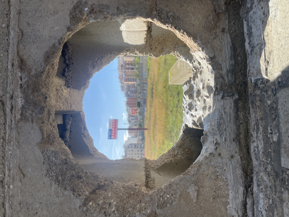 - "The image captures an outdoor urban scene in Badalona, Spain, viewed through a circular, irregular aperture in a rough, weathered grey concrete barrier" by FM-yO6Bi1, licensed under CC BY 4.0