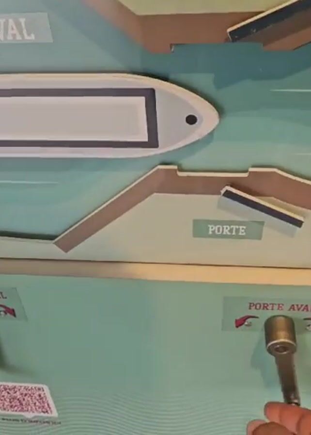 n interactive display of a canal lock system. The display has a diagram of the canal with sections labeled "Bief Aval" and "Porte," with handles underneath each section labeled "Vantelle Aval," "Porte Aval," and "Vantelle Amont." A hand turns the handle labeled "Porte Aval," with a corresponding light turning on next to it. The display is mounted on a wall with light-colored bricks.