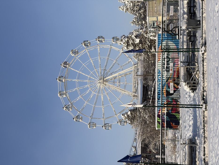 A Ferris wheel stands against a clear blue sky, its white frame sharply contrasting the vibrant colors of a graffiti-covered structure nearby. Patches of snow blanket the ground, dusting the bare branches of trees and the metal fencing surrounding the area. Blue flags are also nearby.