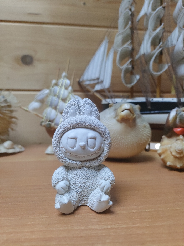 A white, textured figurine of a creature with rabbit ears sits centered on a wooden surface