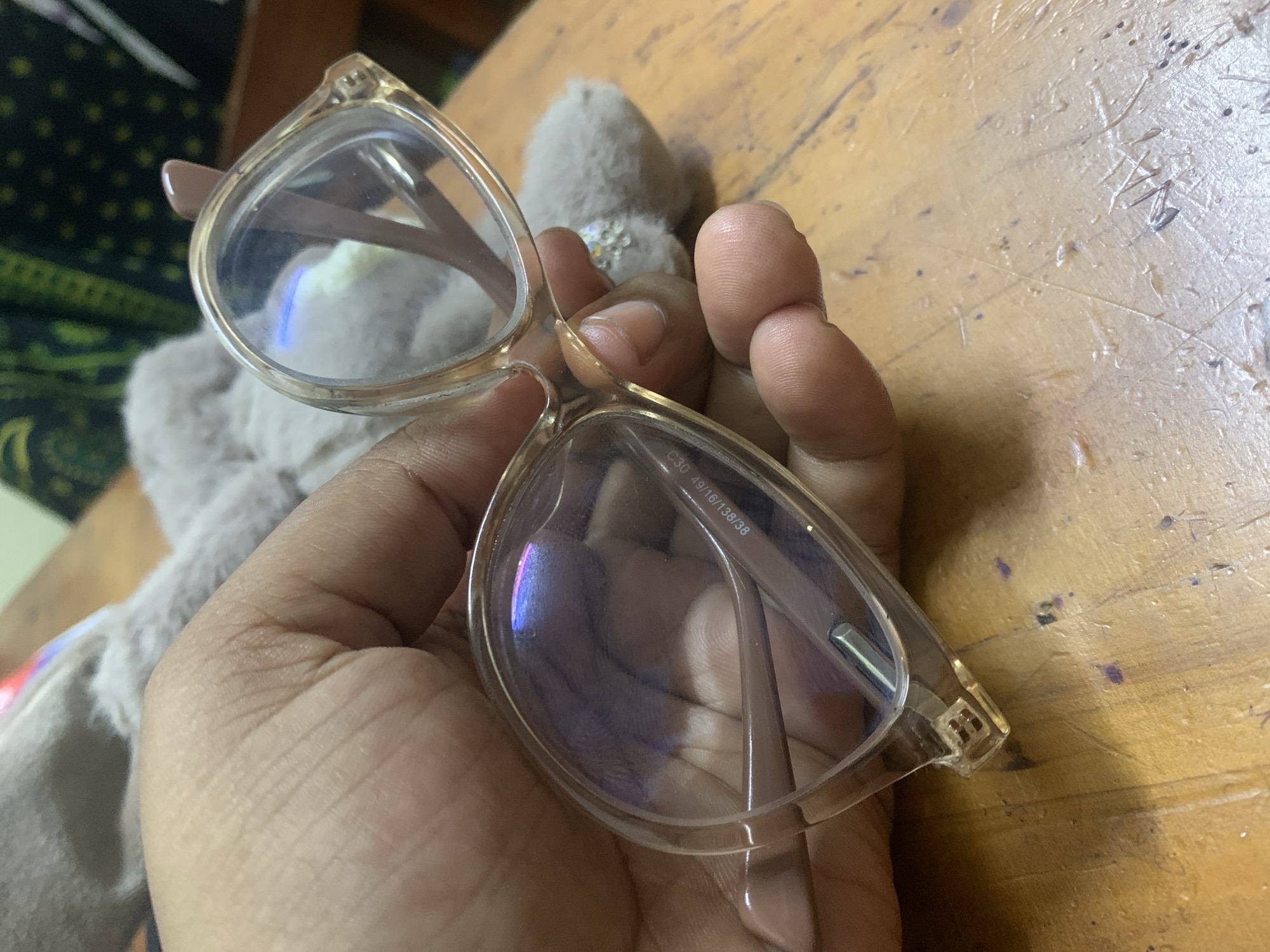 A hand holds a pair of translucent beige glasses. The glasses are held up close, with the left lens angled slightly towards the camera. The lenses reflect light, showing some glare and internal reflections. The arm of the glasses has text on it: "C30 49/16/138/36". A stuffed animal is in the background, partially obscured by the hand and glasses. The background also includes a wooden surface with scratches and marks, and a glimpse of patterned fabric in the top left corner. There is no identifiable location within Dar es-Salaam, Tanzania.