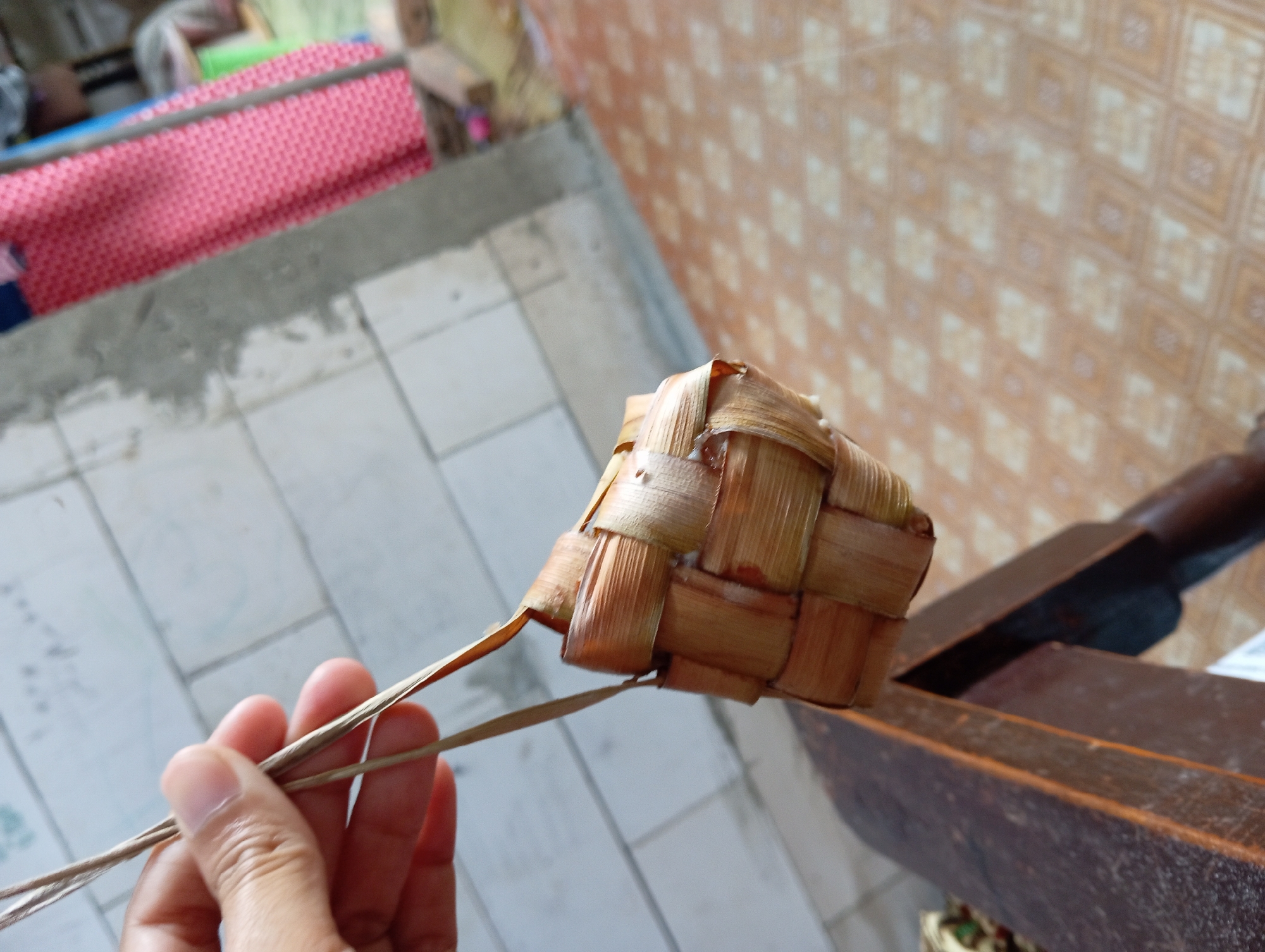A light-skinned human hand holds a small, woven, light brown palm frond container, consistent with a ketupat wrapper, by its extended frond handles. The object is suspended in the air. The immediate background features a light-colored, possibly concrete or tiled, wall with faint dark markings on the upper left. To the right, a vertical expanse of red and white patterned fabric with a blue border is partially visible, behind which indistinct shapes suggest furniture or other items, including what appears to be a green stool. A dark brown wooden surface, possibly part of a chair or bench, is visible in the lower left foreground. The floor is tiled with a repeating geometric pattern of light brown and beige squares or diamonds. This scene is located in Baron, Indonesia.