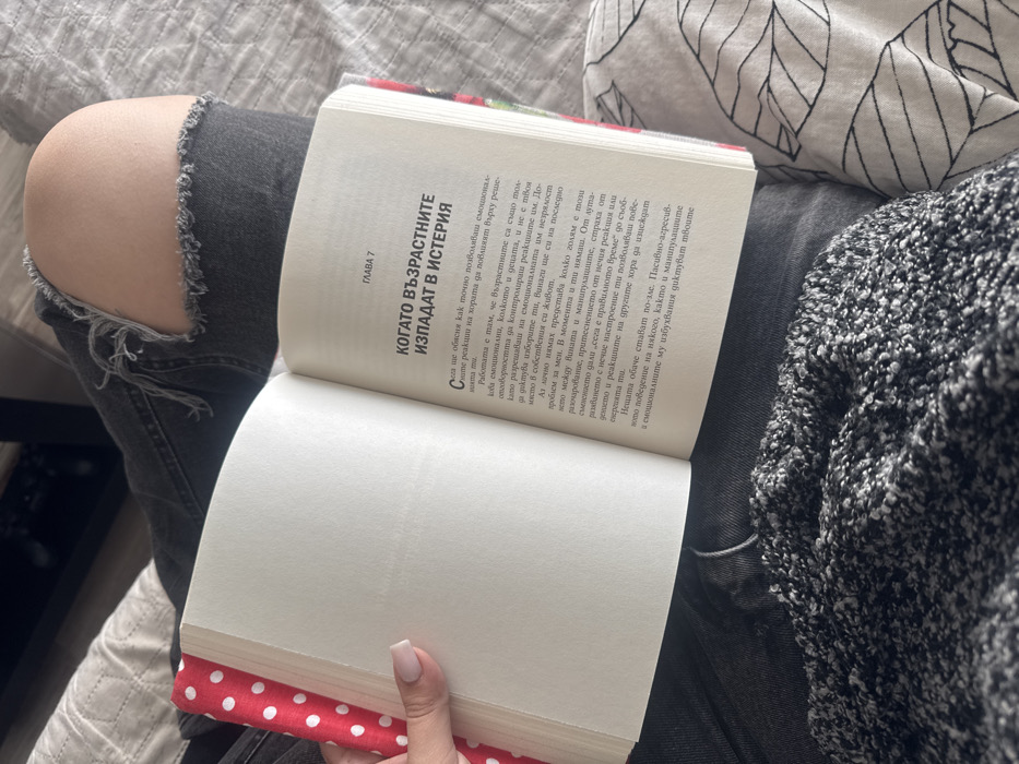 The scene depicts a person seated or reclined indoors in Sofia, Bulgaria, engaged in reading. The upper half of the person's legs and a left hand are visible. The individual is wearing dark grey, distressed denim jeans with large tears at both knees, exposing the skin. The left hand, with manicured fingernails painted a light pink shade, holds an open book. The book displays text in Bulgarian; the visible right-hand page features the heading "ГЛАВА 7" (Chapter 7) and the title "КОГАТО ВЪЗРАСТНИТЕ ИЗПАДАТ В ИСТЕРИЯ" (When Adults Fall Into Hysteria). A red fabric with white polka dots is visible on the left side of the book, adjacent to the spine. Below the book and jeans, a textured, mottled grey and white fabric is present. The immediate environment includes a white quilted surface and a fabric with black linear leaf patterns, consistent with bedding or upholstery. A dark, blurred object is partially visible in the distant background.