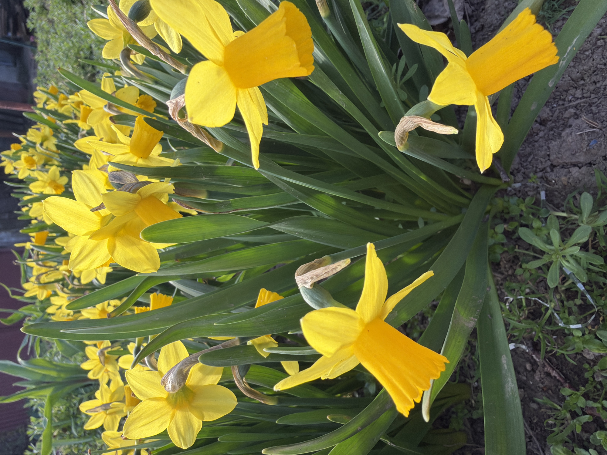 The image displays a close-up, eye-level view of a dense cluster of Narcissus plants (daffodils) in bloom, situated in an outdoor garden within the city of Dolna Mitropolia, Bulgaria. Numerous individual daffodil flowers, characterized by their bright yellow petals and prominent trumpet-shaped coronas, are visible, occupying the foreground, midground, and extending into the blurred background. The flowers are interspersed with abundant long, strap-like, dark green leaves. Several dried, light brown spathes are present near the base of some flower stems. The ground in the lower portion of the frame consists of dark brown, somewhat clumpy soil, with sparse patches of small green weeds. The background contains blurred green foliage and indistinct structural elements, including a reddish-brown vertical post. The scene is illuminated by natural daylight. No human or animal subjects are present.