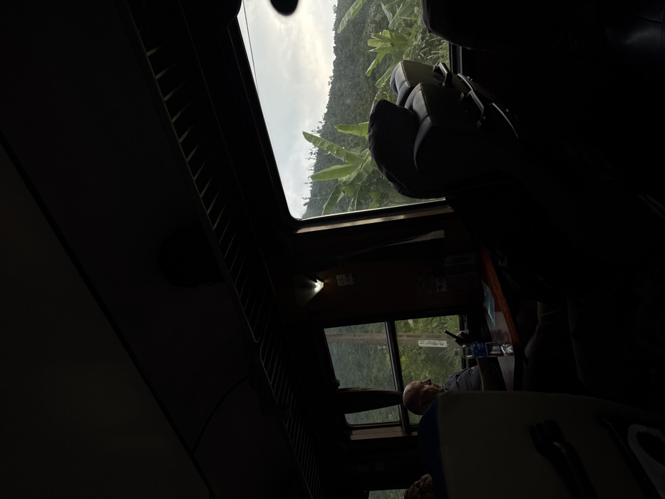The dimly lit interior of a train car frames an external view through the windows. Lush greenery, including banana trees, lines the distant landscape seen through the overhead window. An older man with a shaved head is visible in a lower window, resting in his seat with a bottle of water nearby. The rest of the car interior is shrouded in shadows, partially obscuring the seating and overhead compartment details.