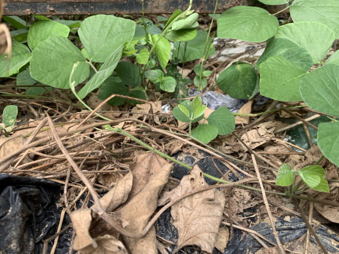 This image depicts a ground-level view of an outdoor area in Ikot Mbonde, Nigeria, characterized by dense vegetation and scattered debris. The foreground is dominated by a layer of dry, brown leaves and numerous brittle twigs. Emerging from and intertwined with this dry matter are several vibrant green plants featuring broad, ovate leaves, along with smaller, newer green sprouts and thin green stems. Within the scene, various man-made objects are present: a crumpled black plastic bag or sheeting is visible in the lower left and along the bottom edge. Scattered pieces of clear plastic debris are observed in the mid-ground, partially obscured by green leaves. Additionally, dark fragments, possibly of glass or plastic, are embedded among the dry leaves in the middle-right section. A dark, horizontal metal bar or structure is partially visible along the top edge of the frame, positioned behind some of the green foliage. No individuals are present, and no discernable actions are occurring. The underlying ground consists of dark soil, largely covered by the organic and inorganic materials.