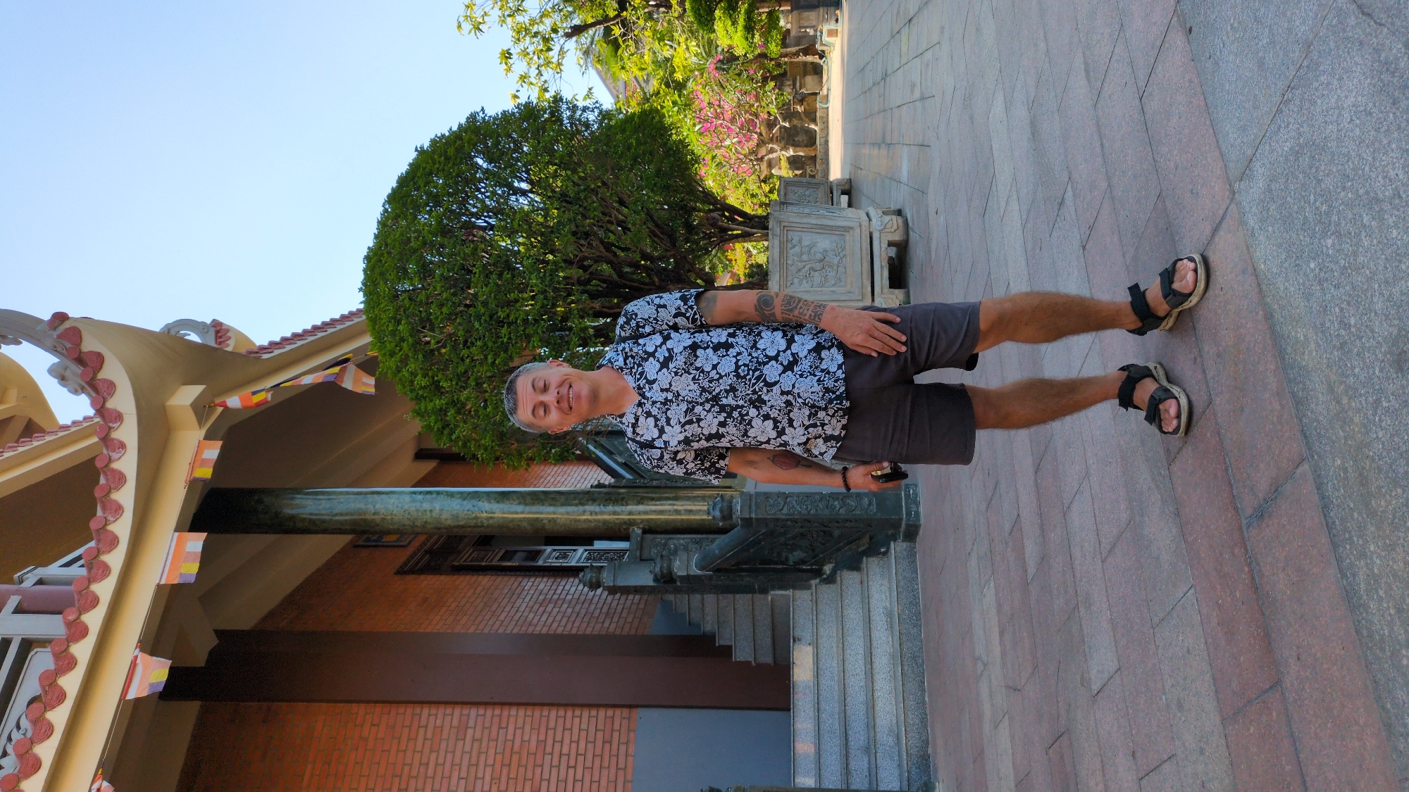 An adult male stands in a paved courtyard in front of a temple structure within Quy Nhon Ward, Vietnam. The man, appearing to be middle-aged with short, grey hair, is smiling with his eyes closed. He wears a short-sleeved black and white floral shirt, dark grey shorts, and black athletic sandals. Tattoos are visible on both forearms. He holds a dark object in his left hand, and a black bracelet is on his left wrist. Behind him to the left, a building with a reddish-brown brick facade features a multi-tiered stone staircase flanked by dark, ornate balustrades and large, dark columns. The building's roof has light-colored curved eaves adorned with red scalloped tiles, from which small, multi-colored Buddhist prayer flags are strung. To the man's right, a large, rounded green tree stands in an ornate stone planter. Further back, additional trees, including some with pink blossoms, are visible in similar planters within a lush garden setting. The ground is paved with rectangular stone tiles in shades of grey and reddish-brown. The sky above is clear and light blue, indicating a bright, sunny day.