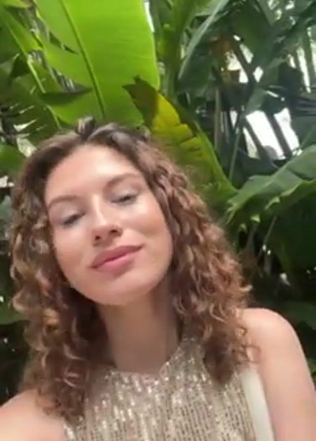 A woman with curly brown hair and fair skin, wearing a gold-sequined sleeveless top, is centered in the frame. She is looking directly at the camera with a slight smile. Behind her, the background is filled with lush green foliage, including large banana leaves. The lighting appears to be natural and diffuse. The camera remains static, and the woman makes no significant movements.