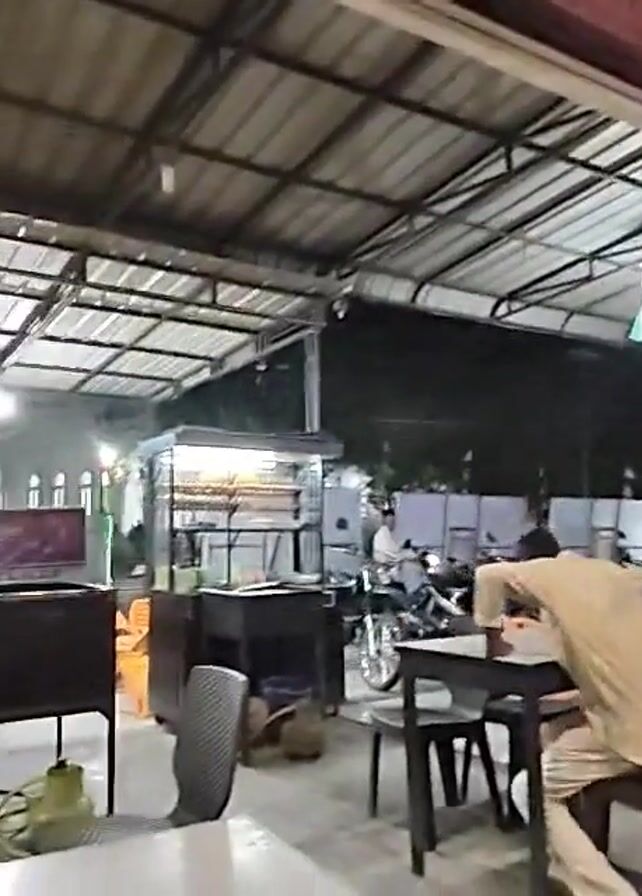 The video depicts a covered outdoor restaurant at night. The camera pans slightly left showing tables and chairs, some stacked up. A person in a beige outfit leans against a table and then walks away. A person in a black t-shirt and jeans walks from right to left. There are motorcycles parked in the background. There's a food cart with illuminated displays. The space is illuminated by overhead lights. The music is playing in the background.