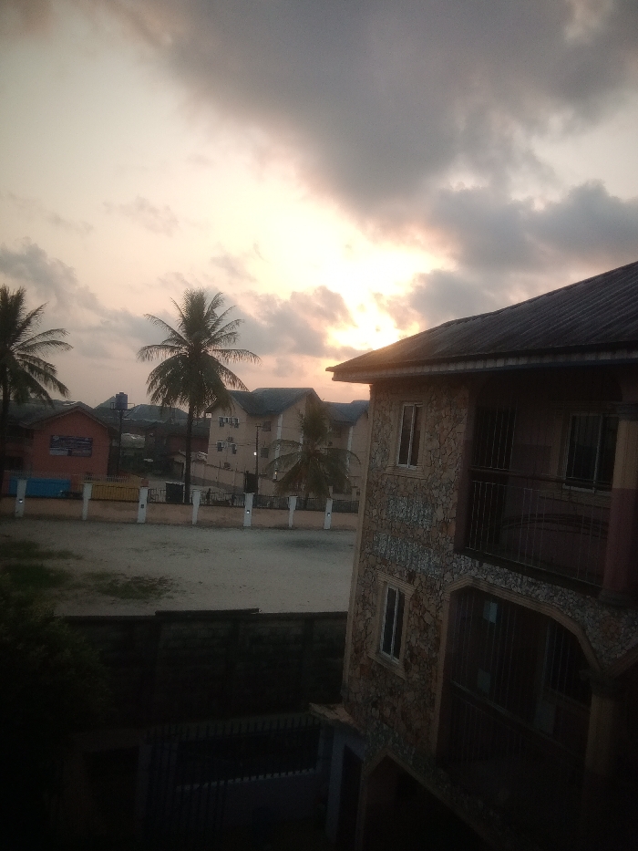 A serene scene unfolds with buildings under a sky aglow with sunset hues. Palm trees stand tall against the horizon, adding a tropical touch. An open space stretches out between the buildings, bounded by a fence in the foreground. The building on the right, clad in stone, displays windows and balconies. The fading light casts a soft glow on the buildings and grounds, creating a tranquil atmosphere.