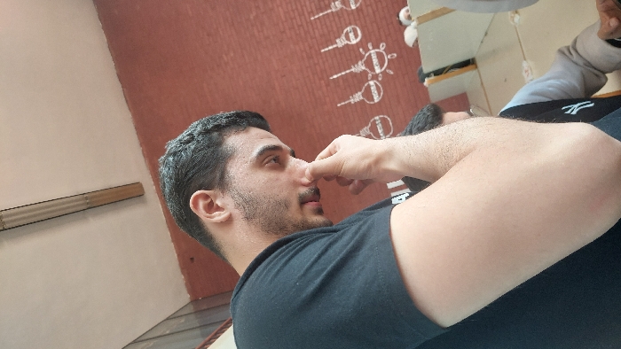 The scene is an indoor environment within the city of Ash-Shaghour Municipality, Syria. The primary subject is a male, likely in his twenties or thirties, with short dark hair and a beard, seen in profile from the upper torso, looking downwards. He wears a black short-sleeved t-shirt. His right hand is raised, with his index finger and thumb pinching the bridge of his nose. Slight perspiration is visible on his forehead and upper cheek. Behind and to the lower right of the primary subject, a second male is partially visible, wearing glasses and a light-colored long-sleeved garment, possibly a jacket, which appears to have a "NY" logo on the left shoulder area. Other indistinct figures are visible further in the background. The background features a reddish-brown wall, possibly brick or painted to resemble brick, decorated with multiple white, stylized drawings of light bulbs. The ceiling is light-colored and has a rectangular fluorescent light fixture mounted on it in the upper left quadrant of the image. Portions of light-colored tables are visible in the lower right background, suggesting a seated arrangement.