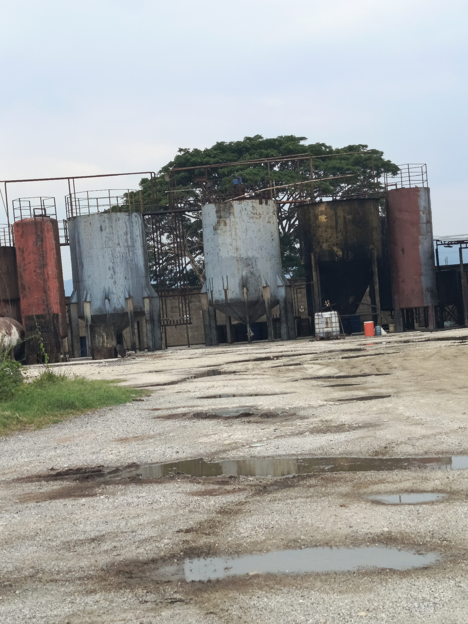 collection of industrial storage tanks, some red and some silver, standing on a gravel lot with puddles of water. These tanks appear weathered and possibly disused. A metal framework connects the tanks at their tops. Behind the tanks, a leafy tree fills the space, partially obscuring the background. The sky is overcast. The location is unspecified within El Bajío, Venezuela. The scene is devoid of human activity and any immediate ongoing actions.