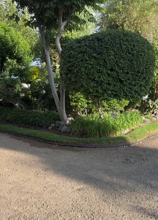 The camera slowly moves to the right across a dirt path, revealing a meticulously landscaped area with various plants and trees. A tree with a light gray trunk stands prominently, flanked by a rounded bush and a patch of green grass with some stones at its base. A sign marked "HEMEROCAL" is visible among the greenery. The overall scene appears peaceful and well-maintained.