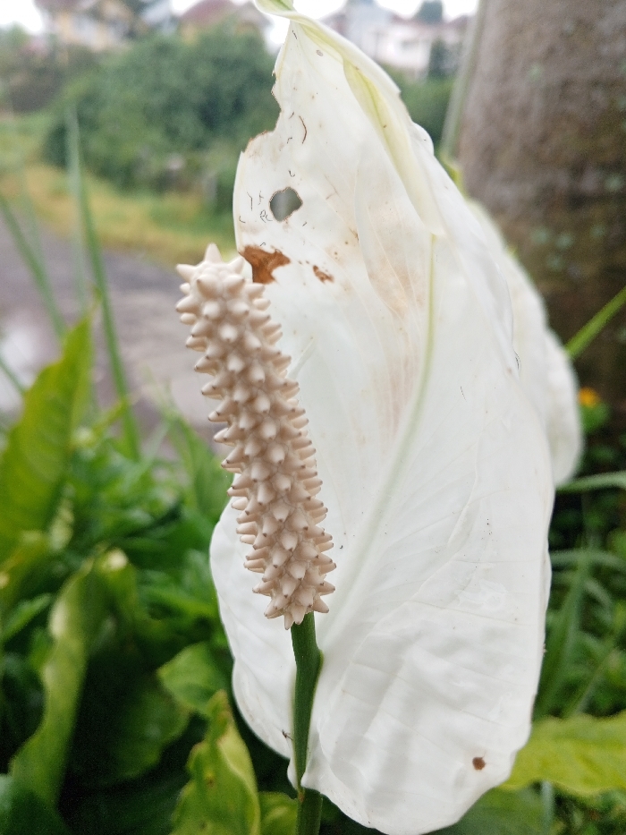 A close-up captures a Peace Lily flower, dominated by a large, white, slightly damaged spathe. The spadix, a creamy-white spike covered in tiny, pointed structures, is prominent in the foreground. The plant is surrounded by green foliage. The background shows a blurred outdoor scene with greenery, a road, and houses in the distance. The lighting appears to be soft and natural, suggesting an outdoor setting.