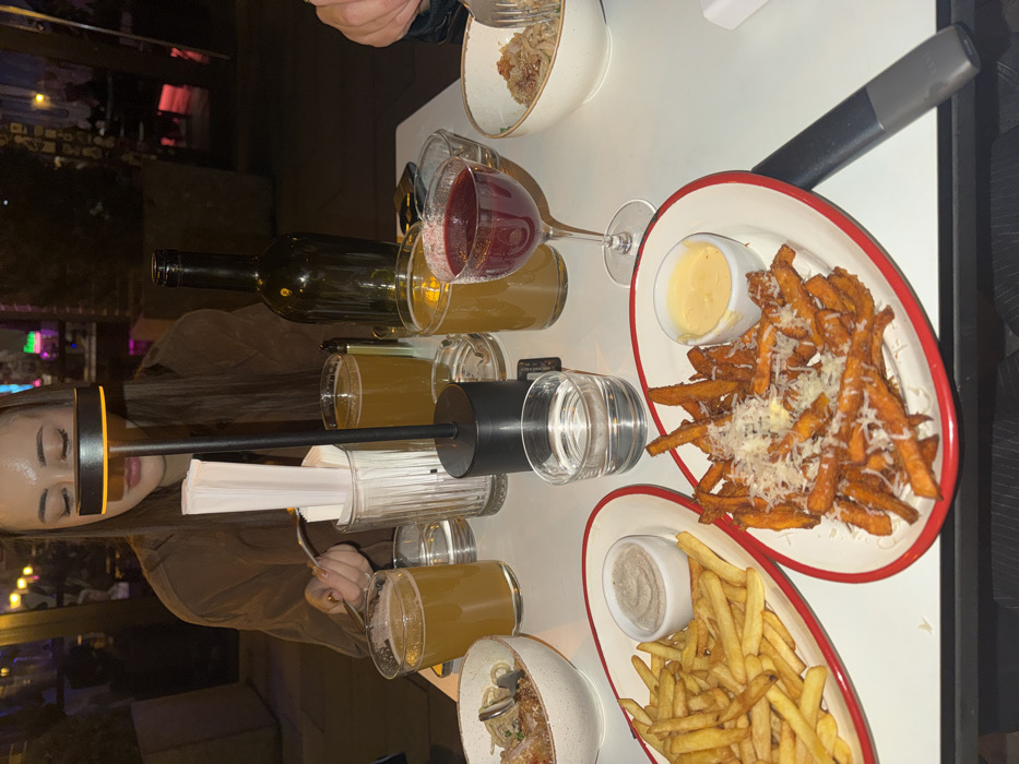 This image depicts a table scene at a modern restaurant or bar in Dnipro, Ukraine, likely in a bustling commercial or pedestrian area during evening hours. The foreground is dominated by a white, rectangular dining table laden with various dishes and drinks. Two individuals are partially visible: a female on the left, shown from the chest up, with long dark brown hair and wearing a brown top. She is looking down, holding a fork over a white ceramic bowl filled with pasta or noodles. Her left hand displays manicured fingernails. On the far right, a second person's hand and forearm are partially visible, also holding a fork over a similar bowl of food. Central to the table is a black, minimalist cylindrical LED table lamp with a flat, illuminated top emitting a warm amber glow. Behind it, a clear glass holds multiple white paper napkins or chopsticks. Food items include two oval, white plates with red rims. The left plate contains a generous serving of golden-brown French fries and a small white ramekin with a light gray dipping sauce. The right plate holds orange-colored sweet potato fries, generously topped with grated white cheese, and a small white ramekin containing a yellow dipping sauce. Beverages on the table consist of two clear glasses filled with an amber liquid, likely beer, situated on the left. A clear glass of water is positioned in the center. A stemmed wine glass on the right contains a dark red liquid, possibly wine or a cocktail. Further back, a tall, empty dark green glass bottle stands. Other objects include two small, clear glass ashtrays and a dark gray rectangular object, possibly an electronic device, on the far right edge of the table. The background is blurred with warm, out-of-focus lights, suggesting an urban outdoor or semi-outdoor setting at night, possibly with string lights or distant neon signs contributing to the ambient glow. The overall scene indicates a casual dining experience.