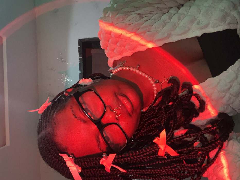 A person with dark skin, wearing glasses and a nose ring, lies on their back with their eyes closed. Braids with pink ribbons adorn their hair. They also wear a pearl necklace with cross pendants. A red light illuminates their face, and a softer light is reflected on the wall. A white, textured surface, possibly a blanket or padding, is positioned above them. The background shows a glimpse of a window or door frame.