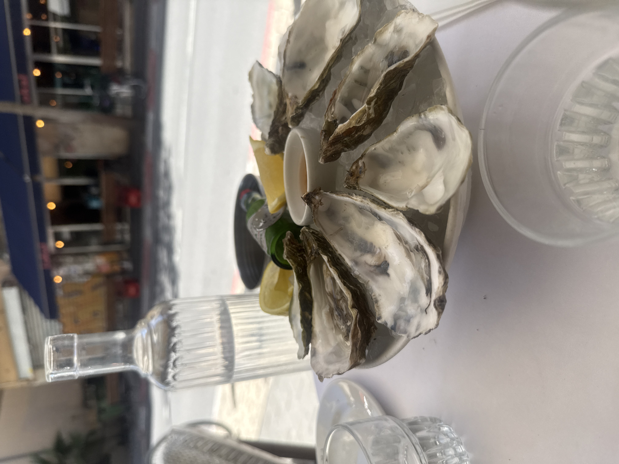 The image displays an outdoor dining setting in the city of Al Jizah, Jordan. A white tablecloth covers the table surface. The primary subject is a circular platter of shucked oysters presented on a bed of crushed ice. Approximately twelve open oyster shells are arranged on the platter, some containing remnants of oysters or liquid. A small white ramekin containing a light brown liquid is centrally placed among the oysters, accompanied by two lemon wedges. To the left of the oyster platter, a tall, clear glass bottle filled with water stands. A partially visible clear ribbed drinking glass is positioned in the lower left, and another clear glass is partially visible in the lower right. The background is blurred, showing a paved street running parallel to the table. Across the street, a building with a dark blue awning and multiple illuminated windows is visible, suggesting a commercial establishment. Faint, blurred shapes indicative of street furniture and a bicycle are discernible in the distant background. No individuals are present in the scene.