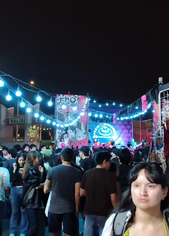 nighttime outdoor concert, likely part of a larger fair or festival. A crowd of diverse individuals stands facing a stage. The stage is decorated with banners, posters, and strings of lights, particularly round bulb lights giving a festive atmosphere. Performers are visible on stage, though their specific instruments or actions are not clear. The crowd seems to be enjoying the event, standing relatively still and observing the performance. The video gives the impression of a lively, communal gathering in an urban environment.