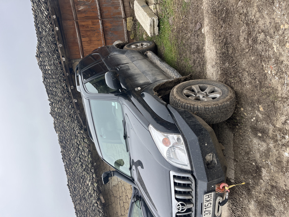The scene is located in Karan Varbovka, Bulgaria. A black Toyota Land Cruiser Prado (120 series) SUV is parked on a muddy, dirt-covered ground. The vehicle faces slightly to the left, exhibiting significant mud splatter on its lower body, wheels, and wheel wells. It is equipped with an aftermarket heavy-duty front bumper featuring an integrated winch, from which a yellow rope with a red hook hangs. A black snorkel is present on the passenger side A-pillar. The front license plate reads "C 3715 KH". In the background, an old, single-story building with a distinctive, weathered dark clay tiled roof is visible. The building's walls appear to be made of stone or adobe. A large, reddish-brown wooden double door with vertical planks is situated on the right side of the building. Two rectangular concrete blocks are stacked on a patch of sparse green grass next to the building, to the right of the SUV. A portion of a second dark-colored vehicle is partially visible on the far left, behind the main SUV's front section. The sky is uniformly overcast and grey. No individuals are present or engaged in any visible actions.