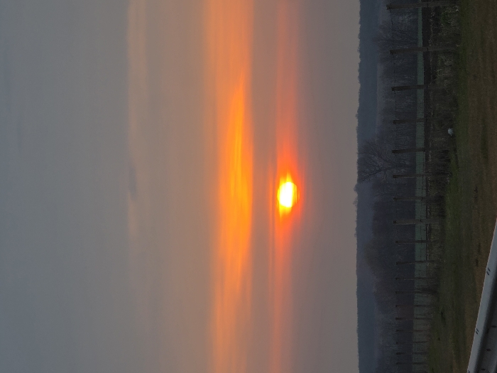 The image depicts a rural landscape at sunset in Plodovitovo, Bulgaria. The sky transitions from a dark gray-blue at the zenith to a vibrant orange and red band closer to the horizon. A bright, intense yellow-white sun, encircled by an orange-red halo, is positioned just above the horizon line. Below the sky, a dark, indistinct line of trees forms the distant horizon. In the midground, a dark wooden fence with vertical posts and horizontal wires runs diagonally from the lower left towards the right. Behind the fence, sparse, possibly deciduous trees and areas of tilled earth are visible. The immediate foreground, particularly the lower left, shows a section of a silver-gray metallic guardrail, and the ground surface consists of dry grass and dirt. No individuals or specific actions are observed.