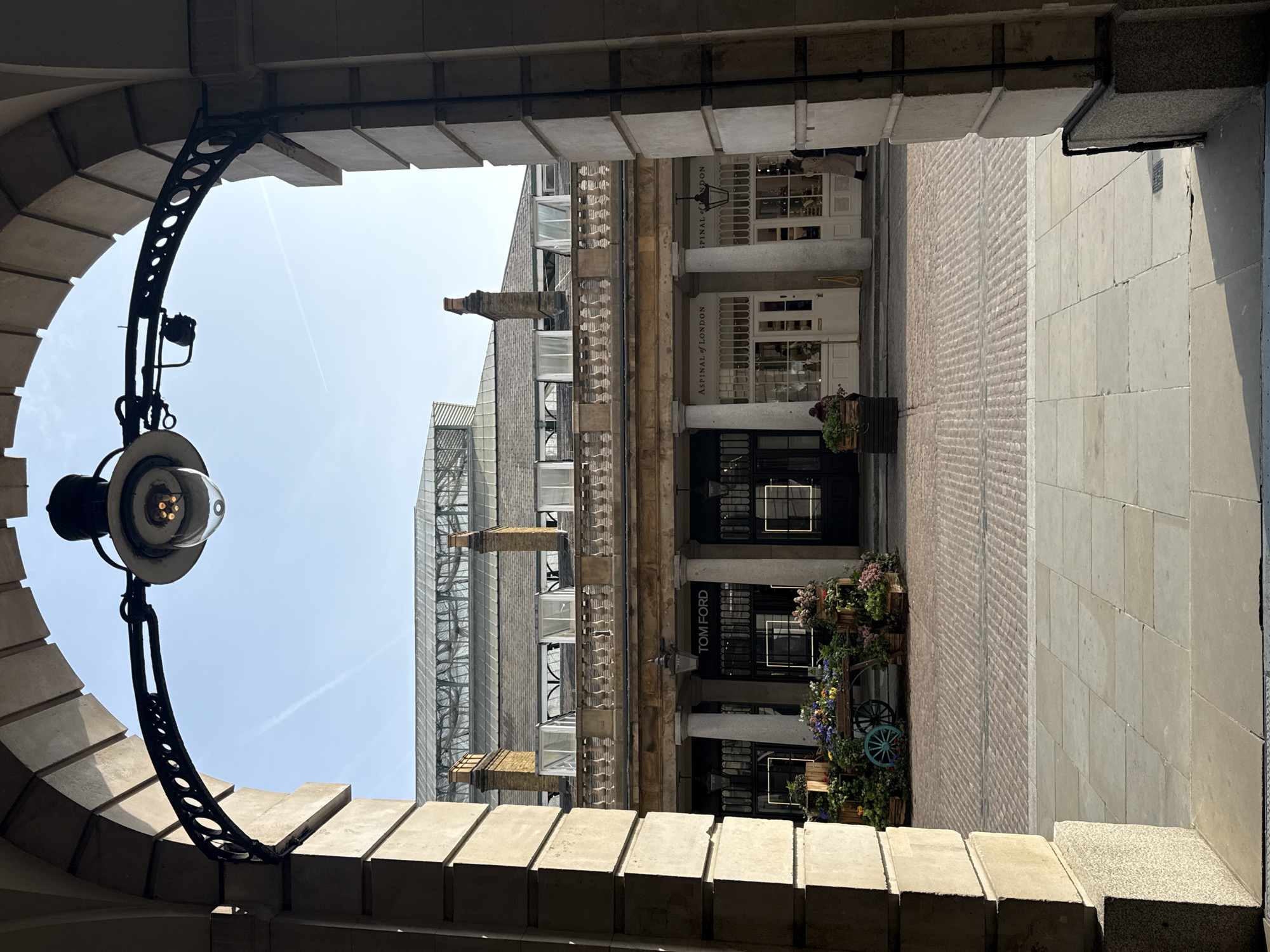 The image depicts a view through a light-colored stone archway, looking out onto a paved public space identified as Covent Garden Market in London, United Kingdom. A black ornate metal lampholder with a clear glass streetlamp containing visible internal bulbs is suspended from the arch's apex. The immediate foreground consists of square light-grey flagstones, transitioning to a reddish-brown cobblestone surface. Directly across the cobblestone area, a row of neoclassical buildings features ground-level commercial establishments. Prominently visible are a black-facade shop with "TOM FORD" in white lettering and a white-facade shop with "ASPINAL OF LONDON" in black lettering, separated by stone columns. In front of the Tom Ford establishment, a decorative wooden cart with two teal-colored wooden wheels is laden with various potted plants and flowers. Additional wooden planters containing diverse flora flank the cart. Above the shop level, a stone balustrade precedes an upper floor with windows and a grey slate roof, where two brick chimneys with stone caps are present. Behind these structures, the large, glazed, and metallic roof of a market hall is prominent. The sky is clear blue, displaying a single faint white aircraft contrail. Two individuals are present: one partially obscured near a planter in front of Aspinal of London, and another walking rightwards past the same shop.