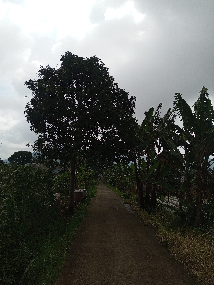 This image depicts a narrow, dark-colored paved pathway extending into the distance under an overcast sky in the city of Kondha, India. A large, deciduous tree with dark foliage stands prominently on the left side of the path in the foreground. Adjacent to its base, a light-colored cylindrical container is visible. Further left, dense green vegetation borders the path, with the roofline of a structure visible beyond it, and distant hills in the background. On the right side of the path, several banana trees with broad, tattered leaves line the edge. Beyond the banana trees, rows of low-lying crops covered with white sheeting are visible in cultivated fields. Two indistinct human figures appear to be walking away from the viewer in the far distance along the path. The overall lighting is dim and diffused, indicative of heavy cloud cover.