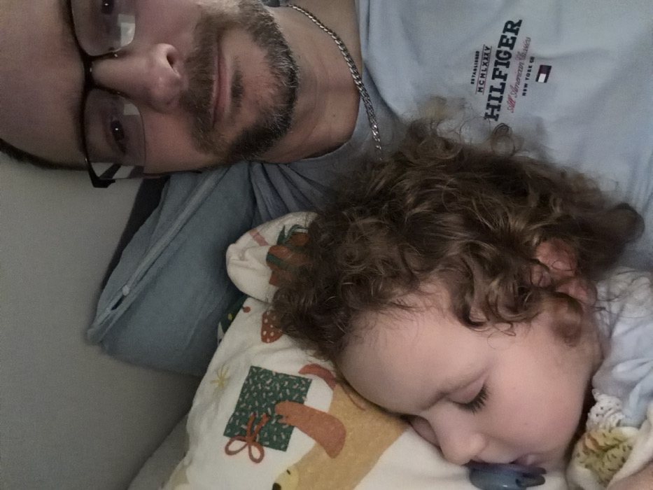 A man with glasses and a beard lies next to a child with curly hair. The man is wearing a blue Tommy Hilfiger t-shirt and a silver chain. The child is sleeping on a patterned pillow with a pacifier in their mouth. They both appear to be lying on a bed with a blue sheet or pillow. The photo is taken from a slightly overhead angle.