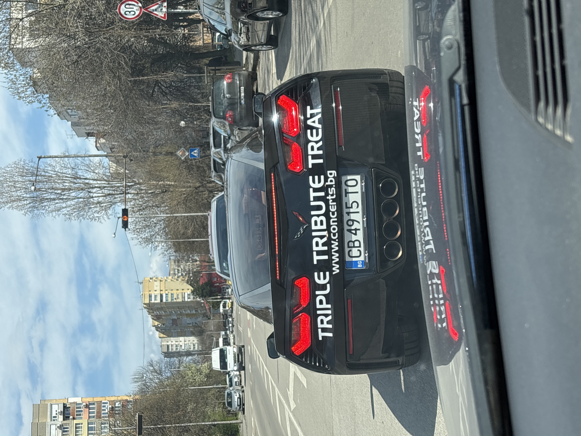 black car stopped in traffic in Sofia, Bulgaria. The license plate is CB 4915 TO. The car behind it has a license plate of HC 1963 KX. A sign for "Triple Tribute Treat" and the website "www.concerts.bg" is affixed to the back of the car. A "30" speed limit sign is visible. Other cars and buildings line the street. The sky is blue with light clouds. A traffic light is above the street.