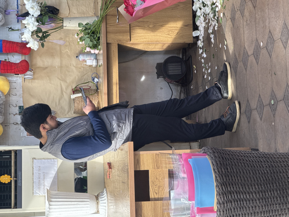 A man stands sideways, engrossed in his phone, positioned next to a flower stall. He wears a grey vest over a blue long-sleeve shirt and dark pants, complemented by black shoes with light soles. The stall showcases various flowers, including white and red bouquets, alongside tools and materials. A black heater sits under the stall, and colorful plastic packaging is nearby. The scene is set outdoors on a patterned tiled surface.