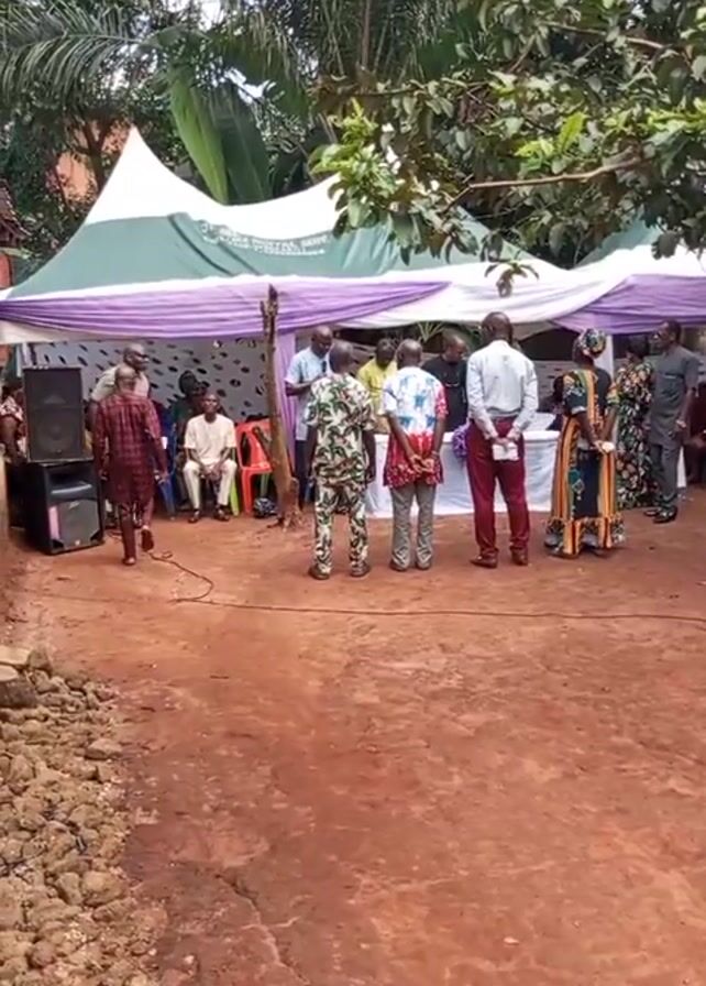 group of people gathered outside under a white and green tent. Some people are seated in chairs and others are standing. There is a table under the tent and a sound system to the side. The ground is reddish brown earth. There are trees surrounding the area. People are wearing a variety of clothing including suits, dresses, and traditional African patterns. Some people appear to be giving an offering.