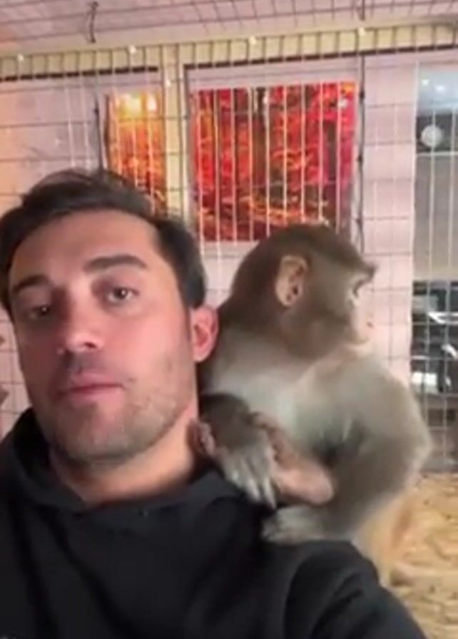 A man with dark hair and stubble wears a black Karl Lagerfeld hoodie. He is holding a phone and recording himself with a monkey sitting on his left shoulder. The monkey is tan, beige and gray in color. The monkey's left hand is resting on the man's chest. The monkey is looking to the right. The background is a gray metal wire cage. There is an image framed and mounted on the back wall within the cage. The image is dominated by colors of red and orange.