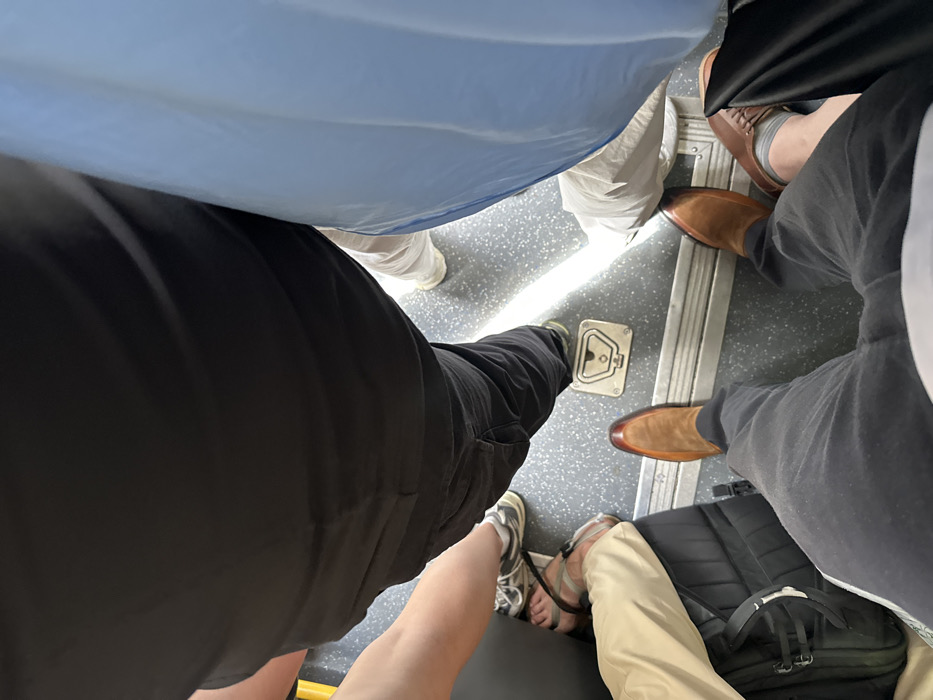 - "close-up, bird's-eye view of the feet of three people standing on the floor of a public transportation vehicle, likely a bus" by FM-wrSCM2, licensed under CC BY 4.0