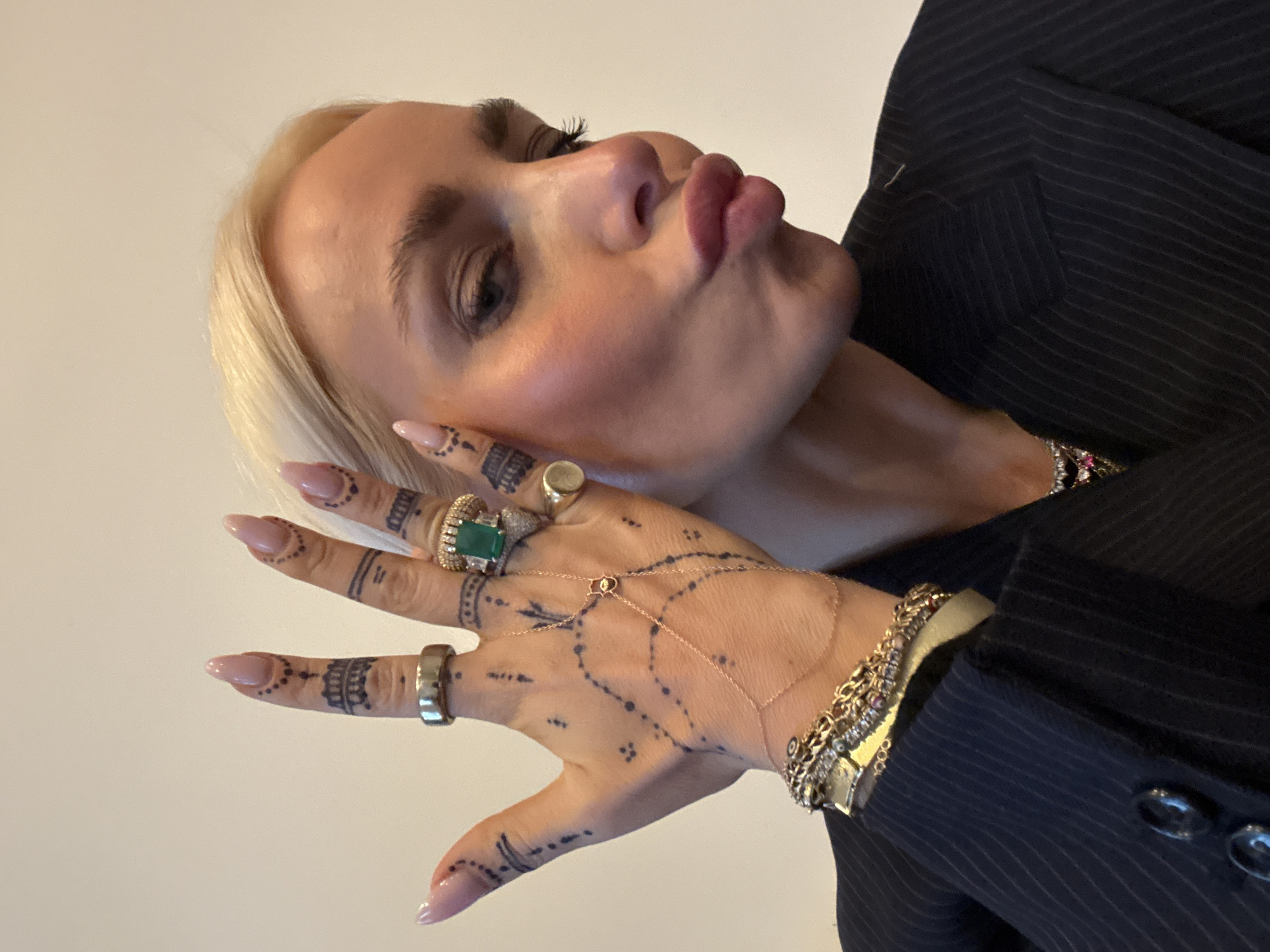 A blonde woman puckers her lips at the camera, positioned slightly at an angle. She is wearing a pinstripe blazer. Her hand is prominently displayed, adorned with various rings including one with a large emerald stone. Intricate henna-like designs mark her fingers and hand, accessorized with a delicate gold hand chain and multiple bracelets on her wrist. The background appears to be a plain, light-colored wall. There is no indication of this photo being taken in London, United Kingdom.