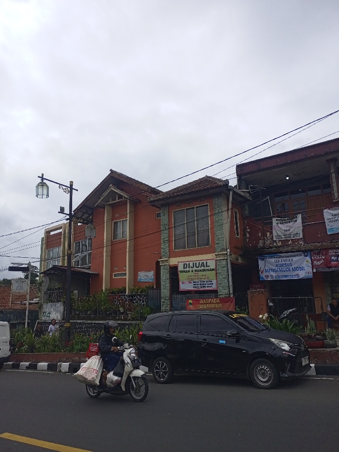 The image depicts an urban street scene in Meyong, India, under an overcast sky. The foreground features an asphalt road with a partially visible yellow dividing line. A person, wearing a dark helmet and jacket, operates a white scooter/moped, transporting several large white sacks on the rear, moving from right to left across the frame. Parked alongside the sidewalk on the right is a black multi-purpose vehicle (MPV) with yellow lettering along its roofline, facing right. The background is dominated by a row of multi-story buildings. The central building is a two-story structure with a reddish-brown facade, a light green textured lower section, and a brown tiled roof. A prominent banner on this building advertises "DIJUAL TANAH & BANGUNAN" (For Sale: Land & Building), with a smaller red banner below it reading "WASPADA CURANMOR" (Beware of Motorcycle Theft). To the immediate right, a more deteriorated multi-story building with peeling reddish-brown paint displays two blue banners; one repeats "DIJUAL TANAH & BANGUNAN" and the other advertises "ISKANDAR KURSUS MENGEMUDI MOBIL" (Iskandar Car Driving Course). The sidewalk area includes a striped black and white curb, a narrow landscaped strip containing small plants, and an ornate black street lamp with a glass lantern on the left. Several individuals are visible on the sidewalk: one person is seated near the rightmost building, and others are standing further to the left. Overhead utility wires are visible against the sky.