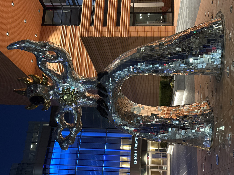 A mirrored mosaic sculpture with a bird-like head and a sun-shaped medallion stands in a public space. The sculpture’s body forms an archway. Behind it, modern architecture features brick and glass facades, reflecting the evening light. "KNIGHT THEATER" is visible on the building. The entire scene is illuminated by artificial lighting.
