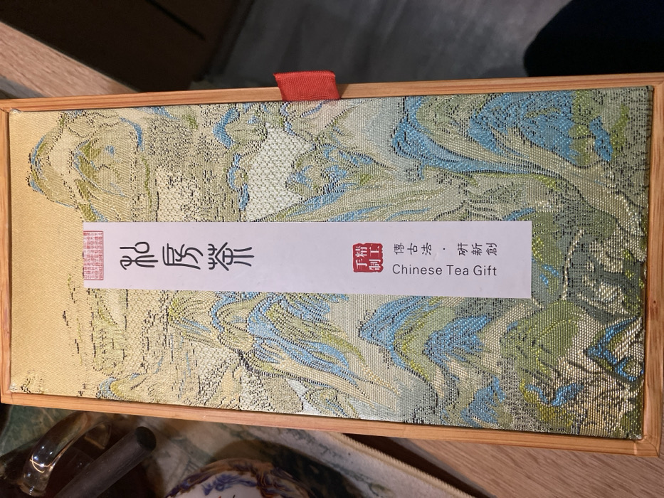 A rectangular wooden box, approximately 35 cm in length, is depicted from an overhead perspective, resting on a light-colored surface, likely wood. The box's lid is adorned with a textured fabric featuring a traditional Chinese landscape motif, rendered in gold, pale green, and light blue hues, depicting stylized mountains and water. Centrally affixed to the lid is a vertical white paper label. The label displays large Chinese characters "私房茶" (Private Room Tea) at the top, followed by a red square seal design containing smaller Chinese characters "手精制" (Handcrafted with refinement). Below this, vertical Chinese text reads "傳古法 · 研新創" (Inheriting ancient methods · Researching new creations), and at the bottom, "Chinese Tea Gift" is printed vertically in English. A small red fabric tab protrudes from the right side of the box, likely indicating an opening mechanism. To the upper left of the box, a clear, irregularly shaped glass object with a pointed end and a dark, cylindrical object are partially visible. A fragment of a white ceramic item with intricate blue and red patterns is seen in the lower-left foreground. The background to the right and top is dark and out of focus. The geographical location, including the city of Rostov-on-Don, Russia, cannot be determined from the visual information provided in the image. No individuals, actions, or direct interactions are visible.