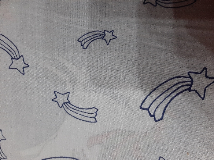 The scene is located in Barza Municipality, Syria. The image displays a section of a light-colored textile fabric, possibly light grey or off-white. The fabric features a repetitive pattern composed of dark blue outlined shooting stars. Each individual shooting star motif consists of a five-pointed star with three parallel, curved lines extending from one side, forming a tail. These patterned elements are randomly oriented across the fabric surface. No individuals, specific objects beyond the patterned fabric, actions, or distinct environmental features are visible within the frame.