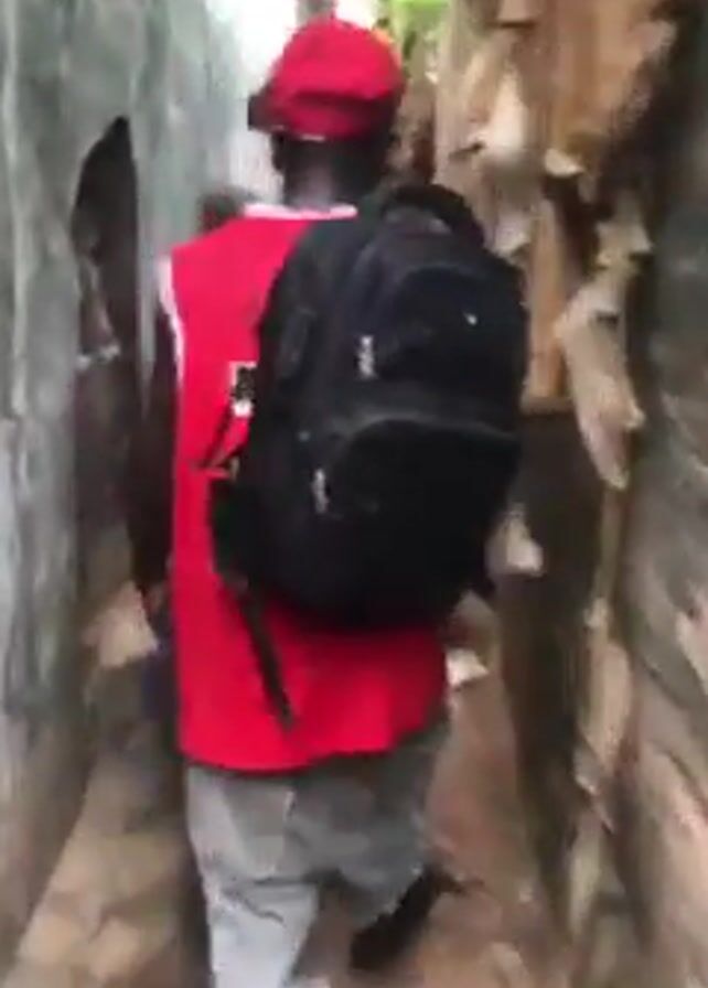 A person wearing a red cap, red and white sleeveless shirt, and grey shorts walks down a narrow passageway between two stone walls. They are carrying a black backpack and holding a small blue object in their hand. The ground is dirt and there are some small plants growing near the base of the walls. The person continues down the passageway, which is slightly overgrown.