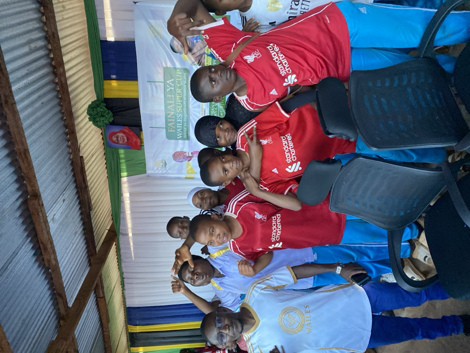 An indoor photograph in Masumuni, Tanzania, captures approximately ten individuals, primarily young people, posing. The background features a white fabric backdrop displaying a banner that reads "FAINALI YA WAILES SUPER CUP SHULE ZA SEKONDARI MKOA MGANI," indicating a secondary school sports event. The banner is flanked by vertical fabric panels in yellow, black, blue, and white, with a framed portrait of a woman in a red head covering and a green fabric decoration positioned above it. The ceiling consists of corrugated metal supported by wooden beams. In the foreground, two black office chairs are partially visible. From left to right, the visible individuals include a man wearing a white and gold "WAILES" t-shirt, glasses, and holding a dark-colored smartphone. Next to him, a young person in a light blue collared shirt makes a heart gesture with both hands above their head. Centrally, two young individuals wear red Liverpool FC jerseys with "Standard Chartered" branding and blue track pants; one makes a peace sign with their left hand while their right arm is around another's shoulder. Other individuals in the group include several young women, some wearing white or black head coverings, and additional young people in athletic wear, many looking towards the camera with varied expressions.