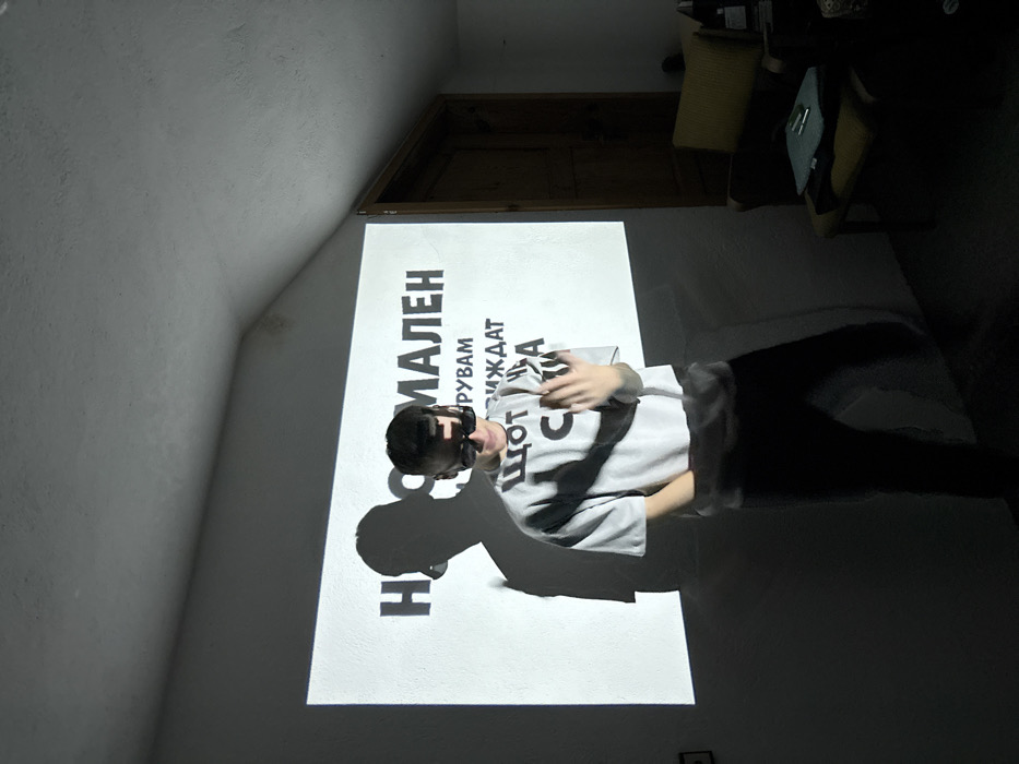 An individual is depicted indoors within the city of Patalenitsa, Bulgaria. The scene is a dimly lit room with light-colored, possibly white, walls and a sloped ceiling. A large rectangular image is projected onto the central wall, displaying black Cyrillic text on a white background. The visible text includes "НЕСОМАЛЕН" on the top line, followed by "РУВАМ ИЖДАТ" and partially "ЩОТ СИЛНА" below. A single person, a young adult with dark, short hair, stands centrally in front of the projected image, partially obscuring the lower portion of the text. The individual wears dark sunglasses, a light-colored (possibly light grey or white) short-sleeved t-shirt with black Cyrillic text reading "ЩОТ СИЛНА" on the front, and dark pants. Their left hand is placed near their waistband, while their right hand is raised, forming a gesture with curled fingers. A prominent shadow of the individual is cast to their left on the projected image, showing the distinct outline of their head and upper body. To the right of the individual, a dark wooden door frame is visible, and further right, a dark armchair with a light-colored cushion holds an object resembling a folder or book and a lighter-colored item on its seat. The floor is dark.