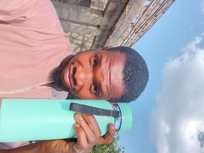 A person with dark hair and a beard holds a green cylindrical object with a black strap. They are wearing a light pink zip-up shirt. Behind them, the sky is visible with scattered clouds. A partially constructed building with wooden beams is in the upper part of the background, slightly angled. The person is smiling slightly.