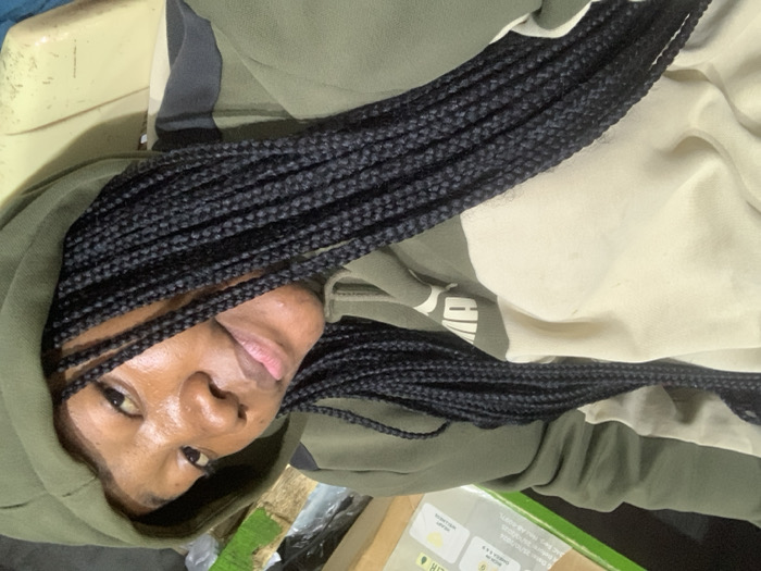 A person wearing a hooded sweatshirt with black braided hair