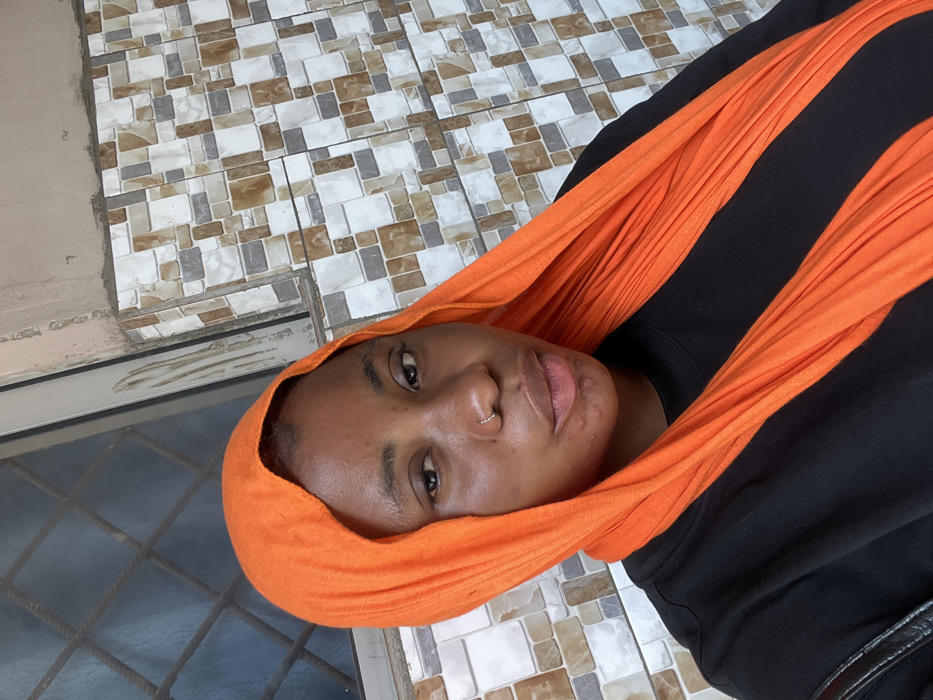 The image displays a head and torso shot of a woman looking directly at the camera. She has dark skin, dark eyes, and a small silver hoop nose ring on her left nostril. Her expression is neutral. She is wearing a black long-sleeved top and an orange head covering, possibly a hijab or scarf, which drapes over her head and shoulders, extending downwards through the frame. The background consists of an outdoor or semi-outdoor wall. The right side of the background features a section of wall clad with multi-colored, rectangular tiles in shades of brown, beige, grey, and white, arranged in a mosaic pattern. To the left, behind her left shoulder, is a window with dark security bars arranged in a grid. Above the tiled section and window, an unpainted, light-colored concrete or plaster surface is visible. A black strap, potentially from a bag or another garment, is partially visible in the lower-left corner of the frame. The specific location within the city of Lokoja, Nigeria, cannot be determined from the visual elements present in this image.