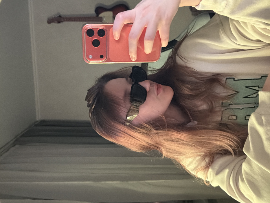 A person is depicted in a mirror selfie, captured indoors. The individual, possessing long, reddish-brown hair, is wearing dark, angular sunglasses with gold-colored accents on the temples and a light-colored, possibly beige, sweatshirt with a partial green graphic or text visible, appearing to be "RM." Their lips are pursed in an expressive manner. A salmon-pink smartphone, housed in a clear protective case and featuring a visible triple-lens camera array, is held in the person's right hand, angled to capture the reflection. The background shows light-colored curtains and, in the upper right, a reddish-brown electric guitar with a light-colored fretboard is visible leaning against a wall. The image provides no verifiable visual information to determine its specific location within the city of Krasnodar, Russia, or any other geographic location.