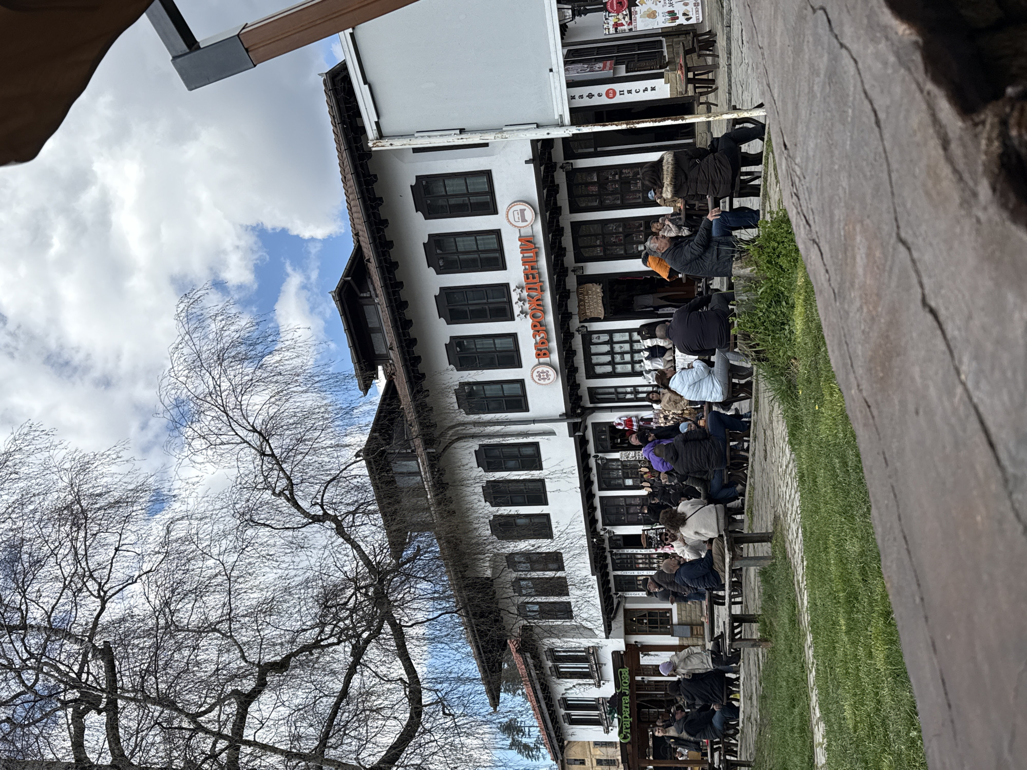 n outdoor dining area in the city of Tryavna, Bulgaria. Several people are seated at tables outside a building with white walls and dark window frames. The building has a sign in Bulgarian, "Възрожденци." The dining area is on a cobblestone or paved surface, with a patch of green grass nearby. A bare tree with many branches stands to the side. The sky is visible with a mix of blue and white clouds.