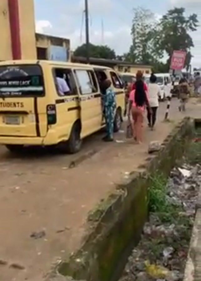 busy street scene in what appears to be a developing country. Several yellow vans, labeled "Students," are parked along a curb, and people are getting in and out of them. Other people are walking along the sidewalk and in the street, seemingly going about their daily routines. The vans may be acting as school transportation. The environment looks somewhat rundown, with visible litter and poorly maintained infrastructure.