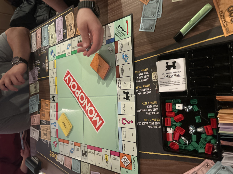 - "The scene depicts a high-angle, close-up view of a Monopoly board game in progress on a wooden table, indicative of a board game cafe or bar in Sofia, Bulgaria" by FM-n525b2, licensed under CC BY 4.0