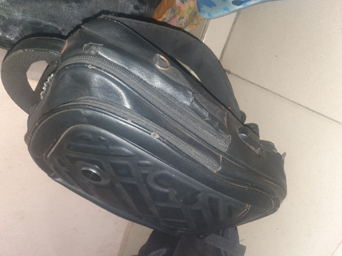 A black, well-worn backpack sits on a light-colored tile floor. The backpack, made of what appears to be a leather-like material, shows signs of wear and tear. It has multiple zippered compartments and padded shoulder straps. A textured design is visible on the bottom of the backpack. The overall setting is simple, with the bag taking up a significant portion of the frame.